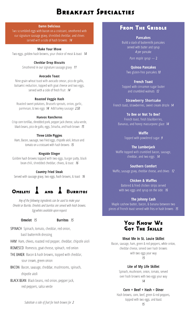 Bacon and hash browns inside, topped with cheddar, sour cream and green onion. Served with a side of hash browns and your choice of toast.