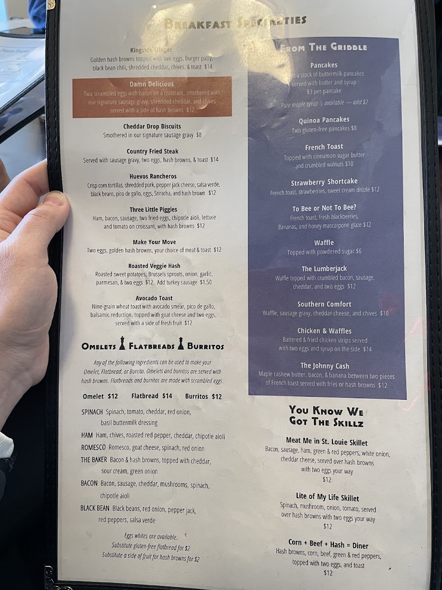Goat cheese, spinach, red onion, Romesco drizzle. Served with a side of hash browns and your choice of toast.
